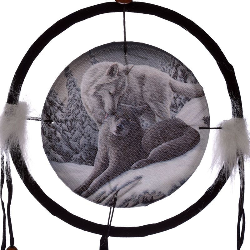 Mustalla tekstiilillä päällystetty kehä. Kuvassa susipari metsämaisemassa. Kehän reunuksilla tekokarvasta tehdyt somisteet ja kolmessa eri kohdassa on kiinnitettynä höyhennippuja nahkanauhoissa.