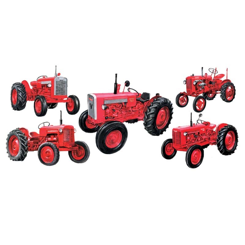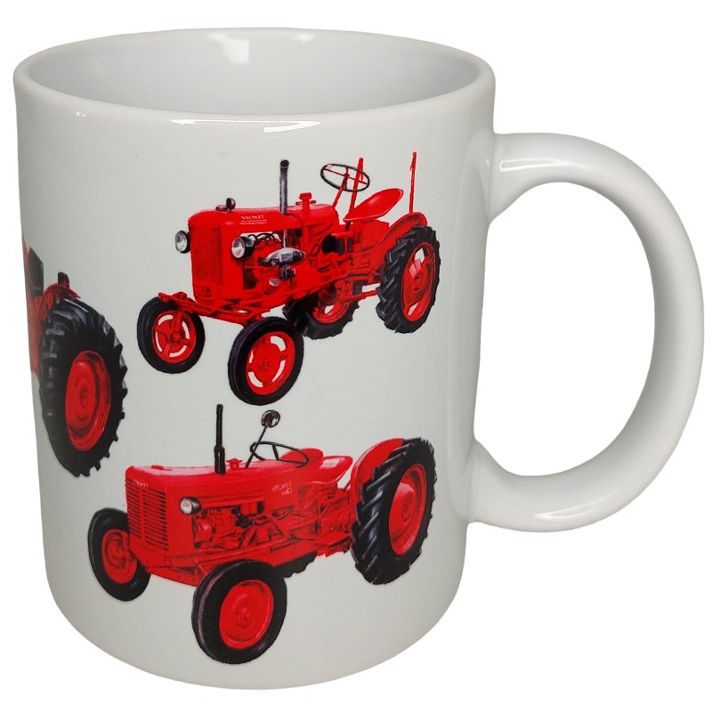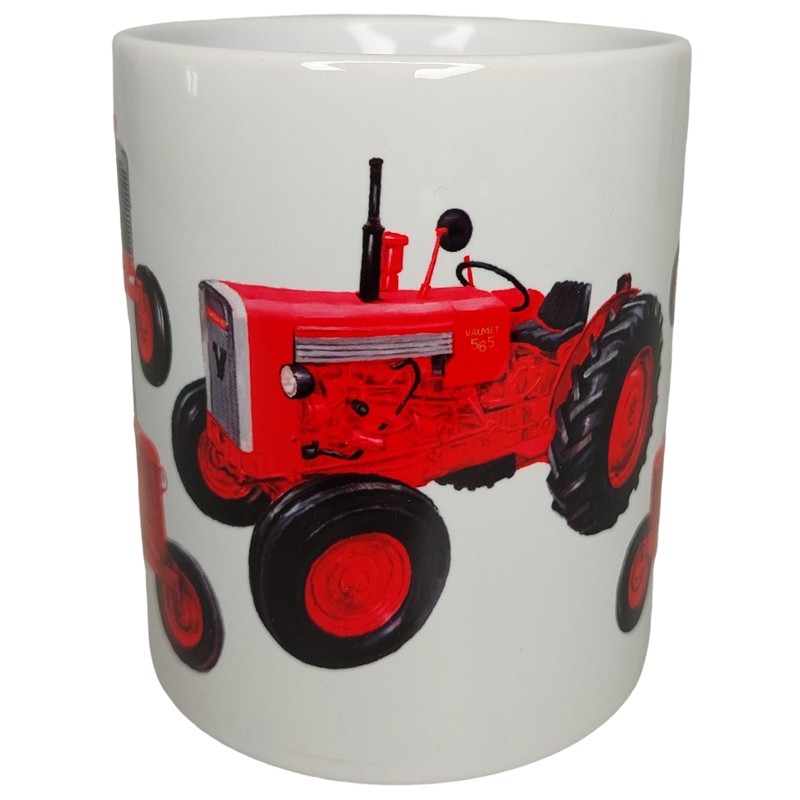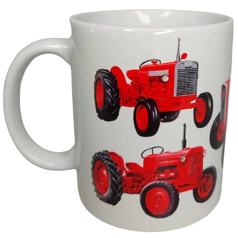 Tukevanmallinen muki on lasitettua posliinia. Mukissa on 1950- ja 1960 -lukujen traktorimallien kuvat: Valmet 15, Valmet 20, Valmet 33D, Valmet 359D, Valmet 361D Valmet 565.