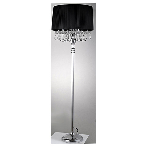 Näyttävä lattiavalaisin. Jalka kromattu. Varjostin vekitettyä kangasta. Kromattujen taivutettujen varsien päässä kuusi lamppua. Lampunkannoissa on lasiset mansetit, joista riippuu lasista hiotut ”timantit” ja pisarat.